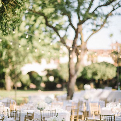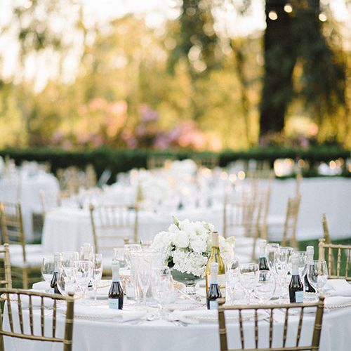 客人们转移到院子的另一个区域参加招待会,草坪上的咖啡馆灯光下摆放着圆桌。因为布里特妮和凯尔想要给他们的派对带来一种清新的、春天气息的感觉,他们选择了纯白的亚麻布和用透明玻璃花瓶装饰的单色花卉。