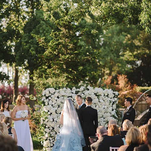 在柳花店Elyse的帮助下,新娘和新郎将已经装备齐全的后院变成了梦幻般的婚礼空间。“她为我们做的最多美丽的花壁我们的祭坛和过道门口两个大金塔的安排,”布兰妮说。