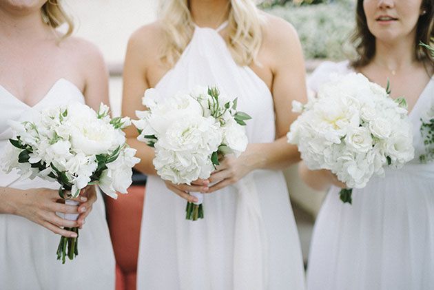 每个女人都拿着一束娇小的白色花束,上面有牡丹和绣球花。