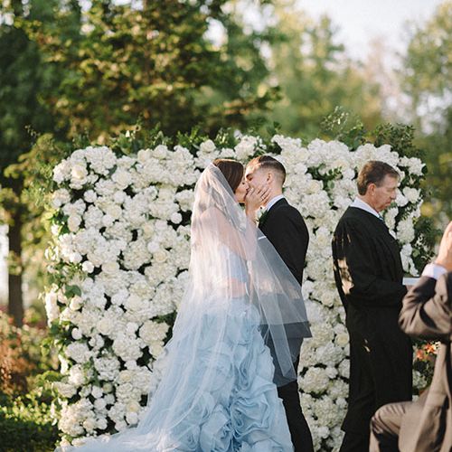 绿色的墙壁上点缀着玫瑰和绣球花,这与新娘的婚纱颜色一致,被设计师称为“蓝色绣球花”。布里特尼和凯尔利用了现有景观的一部分,比如作为他们通道的石头小路。