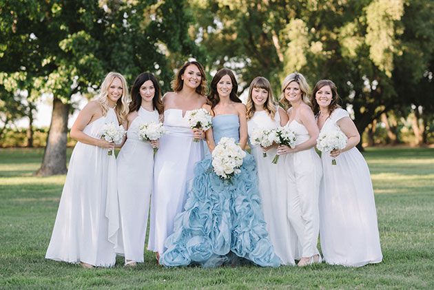 新娘努力寻找一件传统的伴娘礼服,既符合她追求的时尚又简单的审美。相反,她开始在网上搜索,寻找颜色和材质相似但不匹配的衣服。“让我告诉你,彻底的混乱!”Brittney says. "All the bridesmaids didn't even have dresses until weeks before the wedding. And I use the term dresses lightly because one of them穿着一件连身裤,这可能是我最喜欢的婚礼细节之一。”Although it took a great deal of legwork to coordinate her attendant's looks, Brittney couldn't have been happier with the final result.“所有人都看着完全华丽,当我看照片,我仍然在他们的行头笨拙的人。”