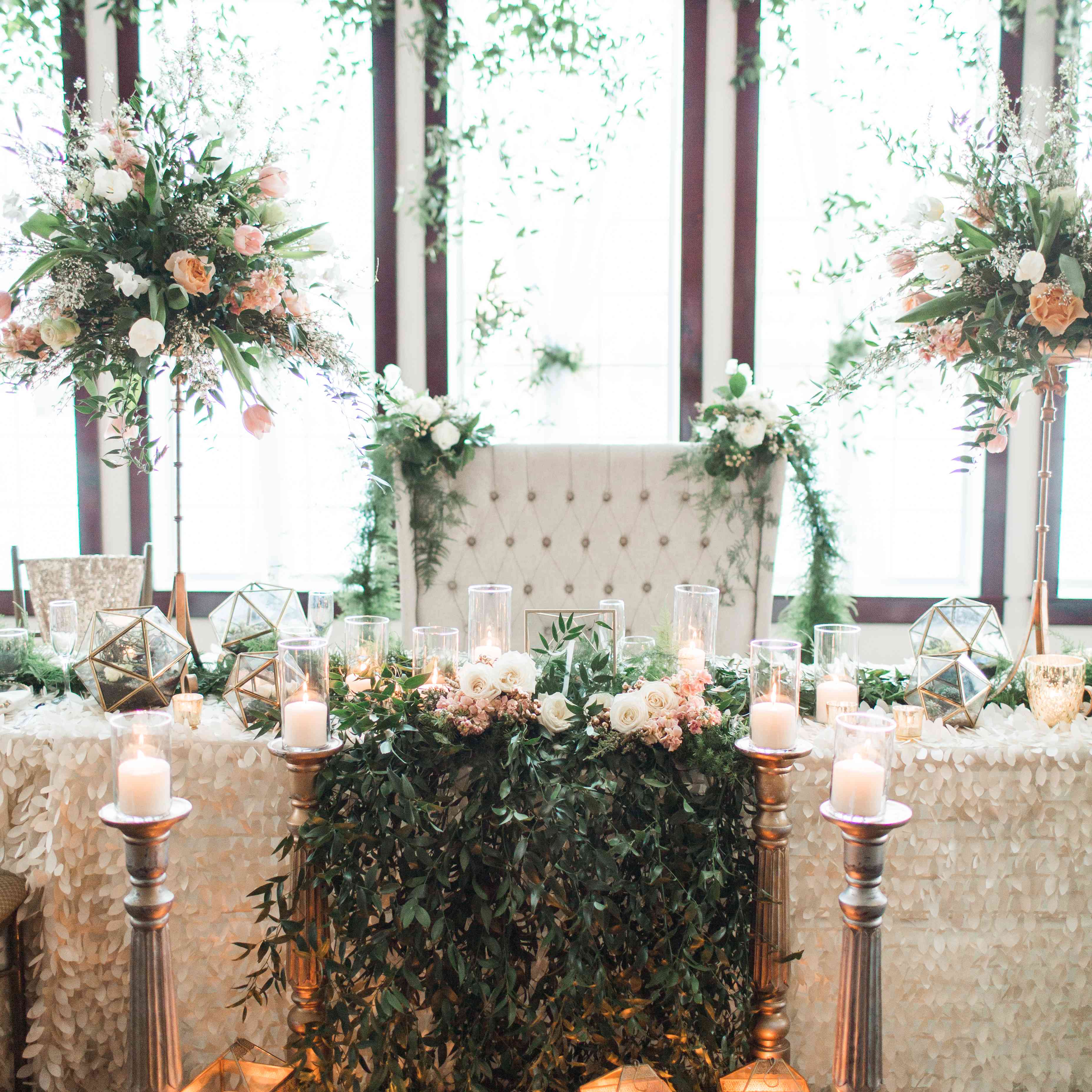 要么做大,要么回家。这张甜心桌子的特色是一个豪华的爱的座位,一排蜡烛,并洋溢着绿色植物。