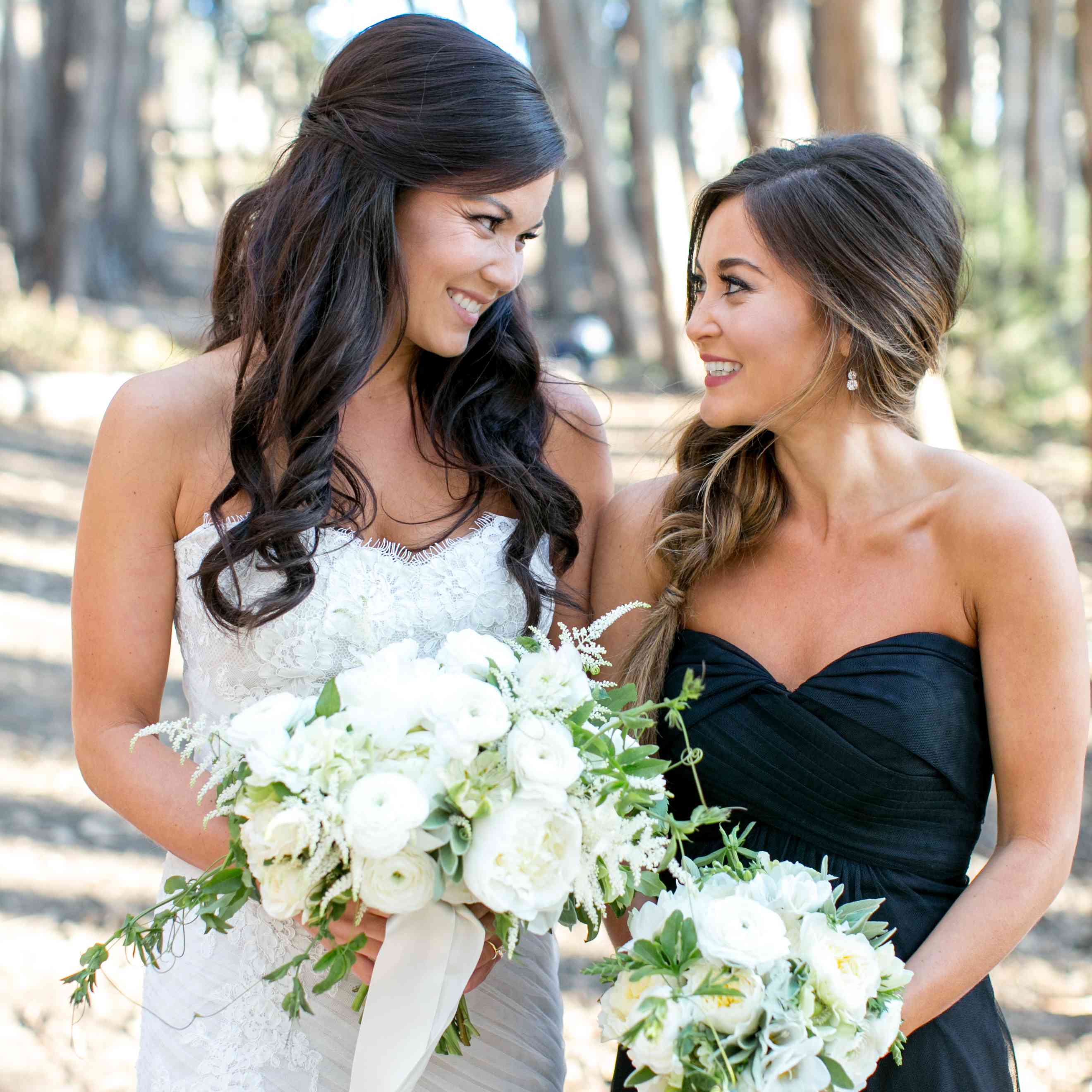 史黛西的姐姐担任伴娘,身穿黑色及地长裙,手持新娘的花束。