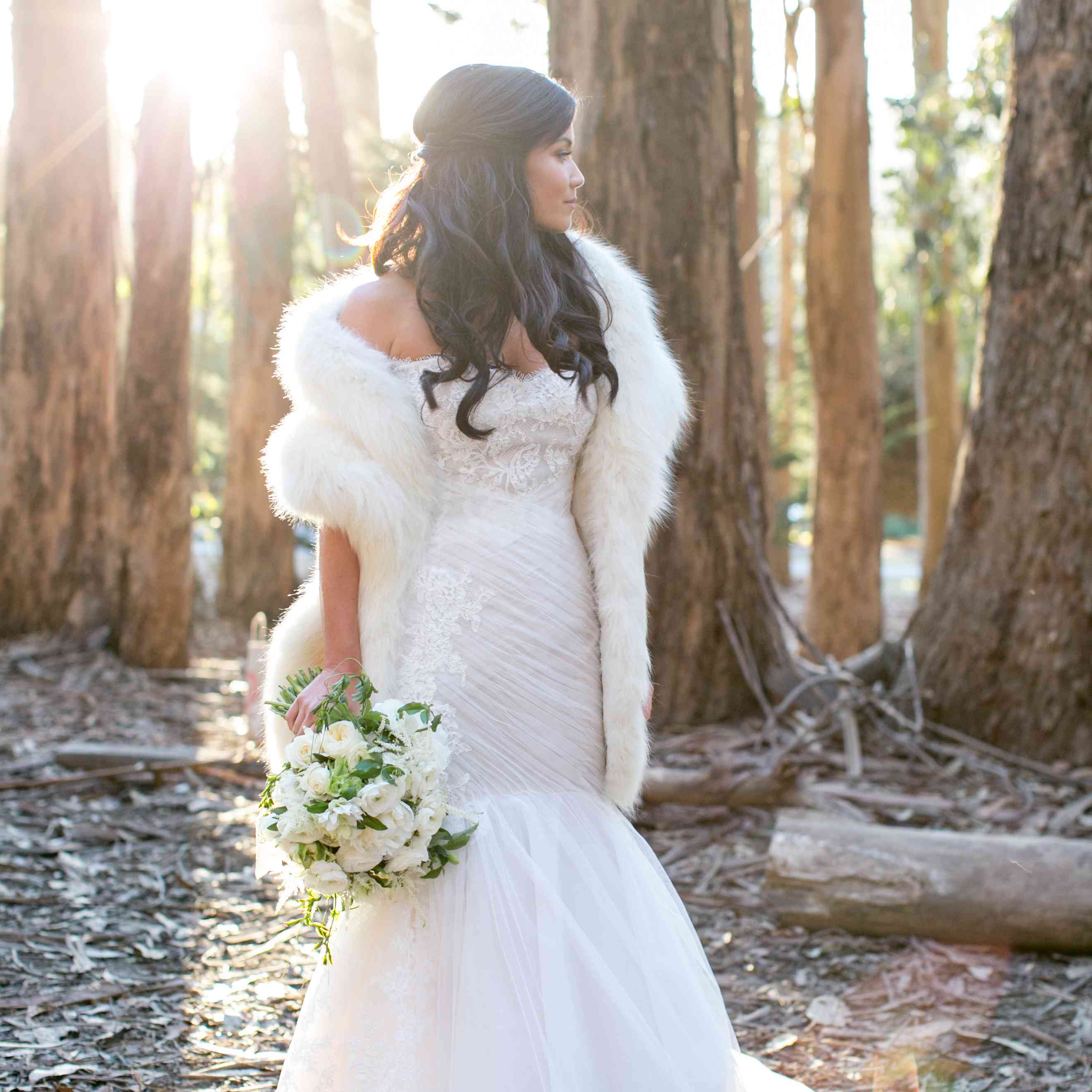 和姐姐购物时,史黛西试穿了这款美人鱼造型的衣服莫尼克•鲁婚纱,多层次的丝绸和白色蕾丝在拉特色调的衬里。“我妈妈没和我们在一起,所以在我扣动扳机之前我们一起回去了。能在那里和他们一起完成我的决定真是太特别了。”新娘说。她把一件毛茸茸的披肩披在肩上抵御秋天的寒意,手里拿着一束用象牙色缎带系着的全白的牡丹、玫瑰、豌豆和秋葵。