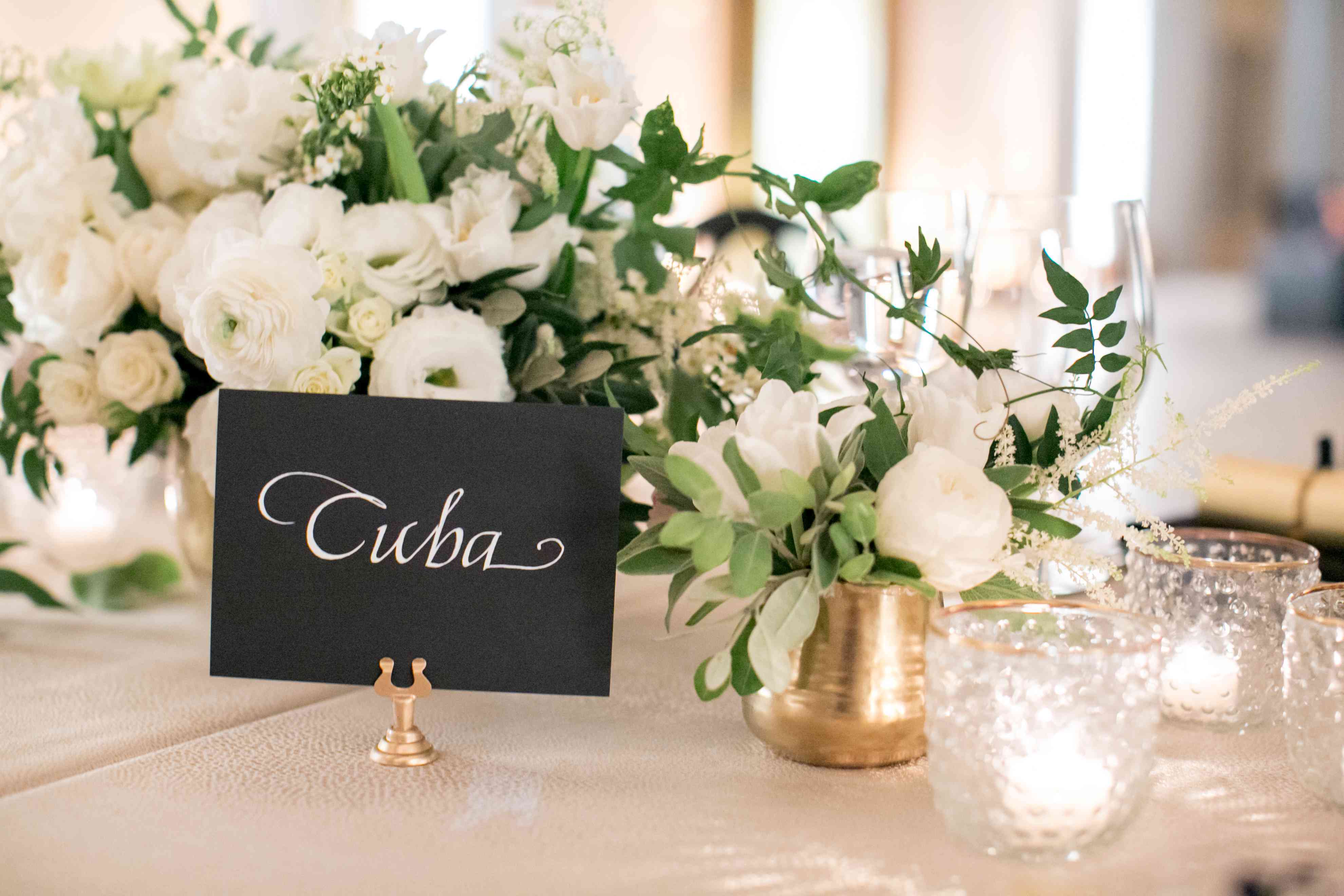在大楼的另一边,客人的座位表被印在船票上,并被安排在一个华丽的框架内。每张桌子都以这对夫妇一起去过的地方命名。