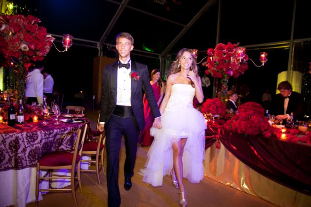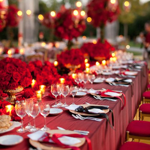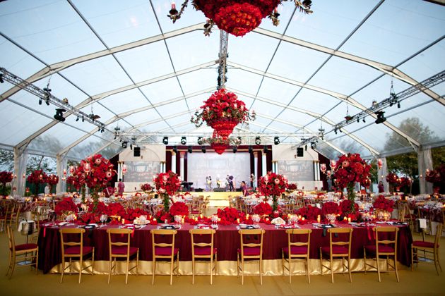 晚宴和舞会在一顶装饰着深红色和金色的帐篷下举行。华丽的吊灯上挂满了玫瑰。餐桌上铺着有质感的亚麻布和高耸的餐桌中央装饰品。