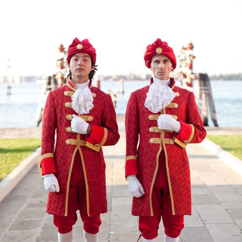婚礼在圣克莱门特教堂前举行,祭坛上滴着白色兰花,与新娘的花束相配。婚礼延续了威尼斯人的婚礼传统,穿着深红色丝绸的男仆和穿着传统服饰的多吉犬迎接宾客。