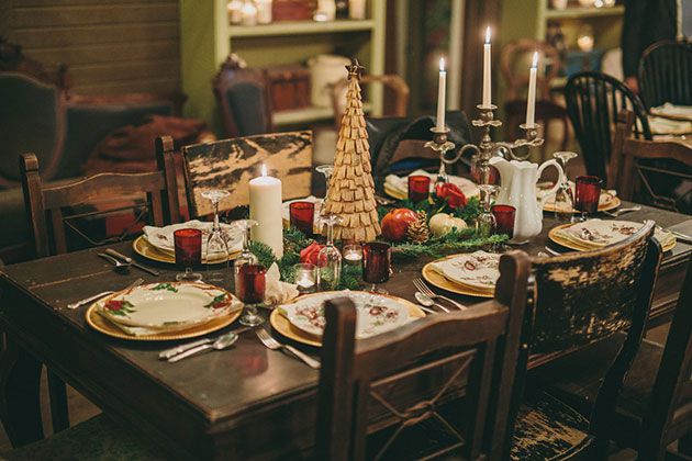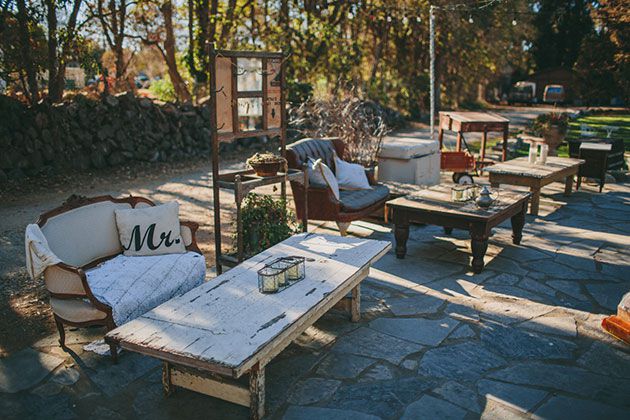 回收的表格,吊灯和码和闪烁的灯光码的组合产生的谷仓内温馨舒适的氛围。每个表功能不匹配的中国,黄金充电器和中心焦点,联合松枝,石榴,金绘松果。在心上人表,塔拉和Kyle坐在覆盖着羊皮和金晶酒杯抿了椅子。