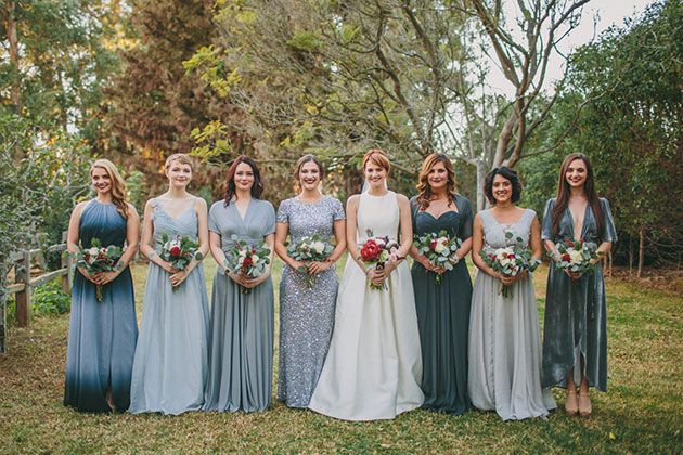 而不是选择一个单一的礼服,塔拉问她的伴娘穿任何落地灰的衣服,他们的喜爱。她拿着暗红色的牡丹和淡粉色的玫瑰花束,而她的“女仆携带的白色和红色玫瑰的混合。伴郎的boutonnieres结合绿地和时令浆果红色花朵。