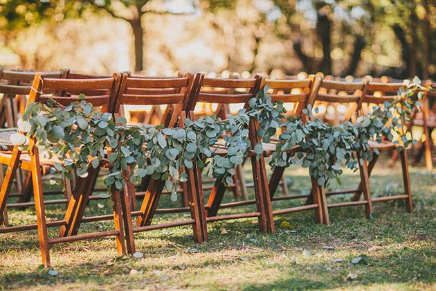 该仪式在酒店的橡树下,用柔软的枝条披木制折叠椅。