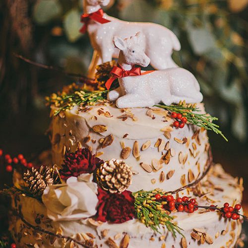 这两个层次的结婚蛋糕,西葫芦饼和奶油奶酪结霜层上,有两个波光鹿,杏仁片,玫瑰,和镀金松果突破。“这是太好吃了!”塔拉回忆。