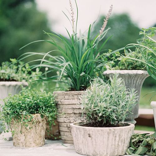 混凝土盆:在不同的混凝土瓮和花瓶中漂亮地分组植物将为您的晚餐表提供优雅的英国花园的感觉。
