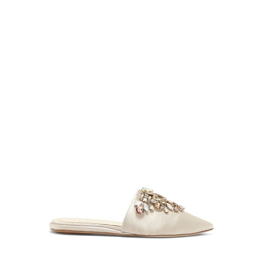 阿丽娜象牙色绸缎尖尖的鞋头平底鞋水晶细节,$ 795Jimmy Choo