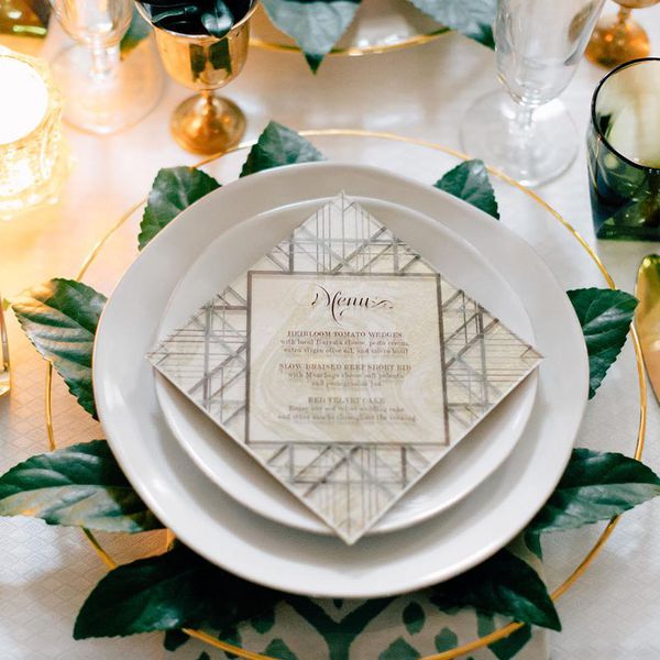 爱一个字母组合?考虑个性化亚麻餐巾纸用新的首字母或客人的个人的名字。采取这种对细节的关注到一个新的水平增加一个古董银英镑餐巾环,并在每个地方设置惊艳美术字卡。(在这件婚纱,夫妻俩甚至还添加了与他们的场地果园觅食梨子果香冲。)